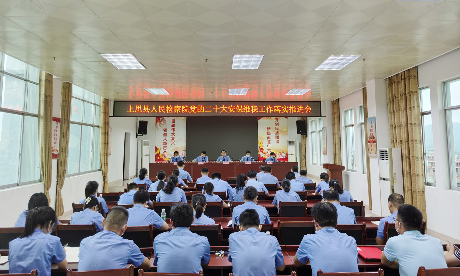 全院干警要充分认识党的二十大维稳安保工作任务的重大意义,把护航党的二十大胜利召开作为中心任务,提高政治站位,强化责任担当,把维稳安保工作与检察办公办案紧密结合,为党的二十大胜利召开营造安全稳定的社会环境。