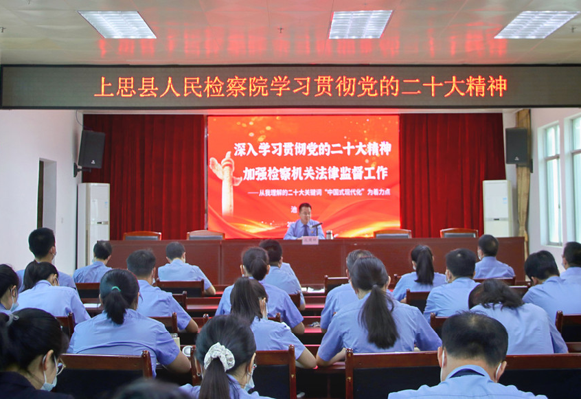 为深入学习贯彻党的二十大精神,把党的二十大精神融会贯穿到检察工作的方方面面,牢记践行“国之大者”,11月21日,beat365官方登录入口_棋牌365大厅_365319377人民检察院党组书记、检察长池国权以《深入学习贯彻党的二十大精神,加强检察机关法律监督工作—从我理解党的二十大关键词“中国式现代化”为着力点》为题,为该院全体干警上了一堂生动的专题辅导课。