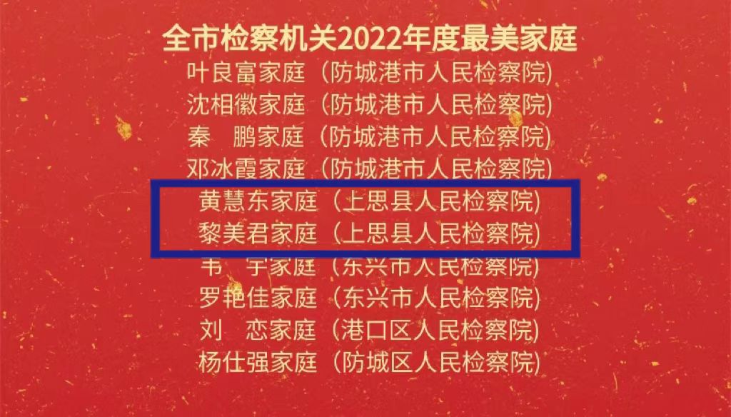 喜报!beat365官方登录入口_棋牌365大厅_365319377检察院两名干警家庭荣获防城港市检察机关 2022年度“最美家庭”称号