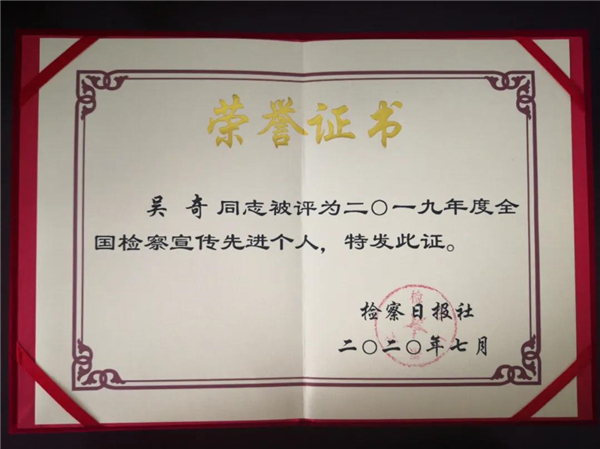 就在笔者发稿前,吴奇又获得了一项新荣誉“二O一九年度全国检察宣传先进个人”,这是他2017年以来连续三年获此殊荣。