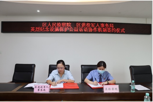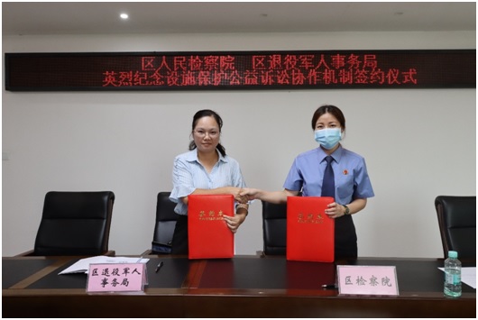1、为贯彻落实开展烈士纪念设施保护专项行动,进一步加强英雄烈士保护领域的公益诉讼工作协作配合,2021年7月26日,防城区人民检察院与防城区退役军人事务局召开座谈会共同签署《关于建立英雄烈士保护领域公益诉讼工作协作配合机制的意见》。防城区人民检察院副检察长李育林、区退役军人事务局副局长陈玉玲出席签约仪式。