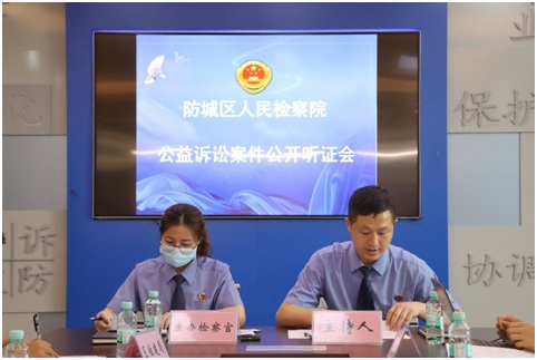 2、2021年7月27日,防城区人民检察院召开窨井盖保护公益诉讼听证会,邀请了人民监督员、人大代表和政协委员担任听证员。听证会上,案件主办检察官李育林宣讲了高检院“四号检察建议”相关内容,并就检察公益诉讼的概念、案件类型等内容向与会人员进行了解读,随后通过PPT展示的方式对案情进行了详细介绍,并对权责认定、履职建议发表了意见。