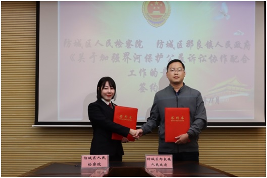 4、11月10日下午,防城区人民检察院与防城区那良镇人民政府在防城院召开座谈会,并举行《关于界河保护公益诉讼协作配合工作的意见》签约仪式。区检察院党组书记、检察长陈瑶,那良镇镇长陈瑛泉出席仪式。签约仪式上,陈瑶和陈瑛泉镇长共同签署了《关于界河保护公益诉讼协作配合工作的意见》,形成了线索移送、信息共享、工作协作、联系会议、普法宣传等工作机制。