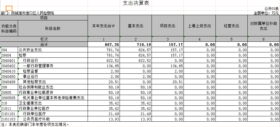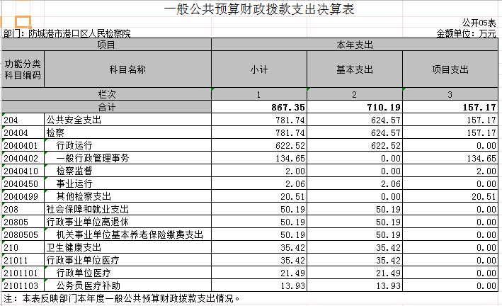 防城港市港口区人民检察院2019年度一般公共预算支出年初预算为685.32万元,支出决算为867.35万元,完成年初预算的126.56%。