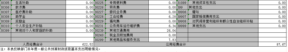 (1)行政运行622.52万元,主要用于职工发放工资福利支出、住房公积金等人员经费支出,及办公费、差旅费、印刷费、邮电费、维修费、培训费等公用经费支出;
