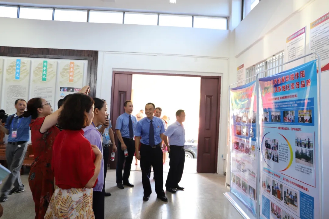 在视察的第二站——东兴市江平镇万尾村,适值当地一年一度的京族重大传统节日“哈节”举行。京族是中国唯一的海洋性少数民族,主要聚居在在东兴市江平镇的万尾、巫头和山心三岛,与越南隔海相望。“哈节是京族独有的民族文化,围绕服务少数民族聚集地的发展,一直以来,我们东兴市检察院自觉把检察工作融入到促进民族团结之中去谋划和推进,充分发挥检察工作职能,为民族团结进步营造良好社会环境……”考察团边参观京族博物馆,边听取黄建森检察长对东兴检察院服务民族工作情况的介绍。在馆内设置的检察工作宣传栏,引起了代表们极大的兴趣和关注,对东兴市检察院设立“国门同心合作工作站”,对京族未成年人、居住在京族三岛的未成年人提供法律援助及国家司法救助、心理咨询及法律宣传的做法表示满意并予以充分肯定,代表们还对着力加强未成年人司法保护工作提出了许多好的意见建议。